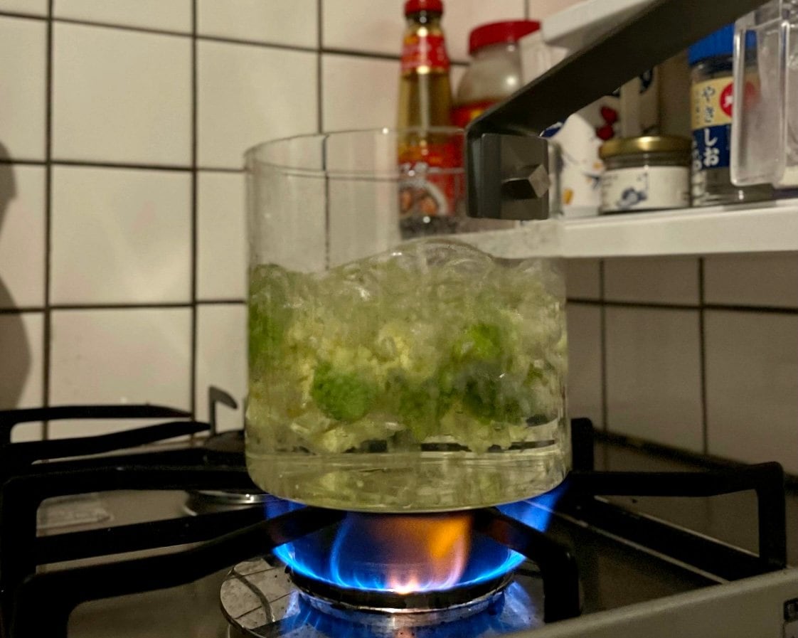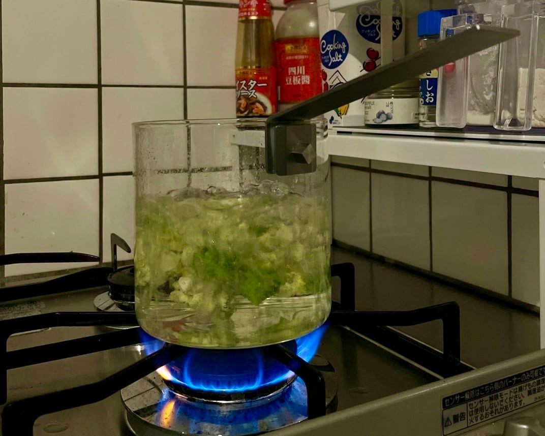 沸騰中に加えると急激に温度があがりガラスに衝撃を与えてしまいます。