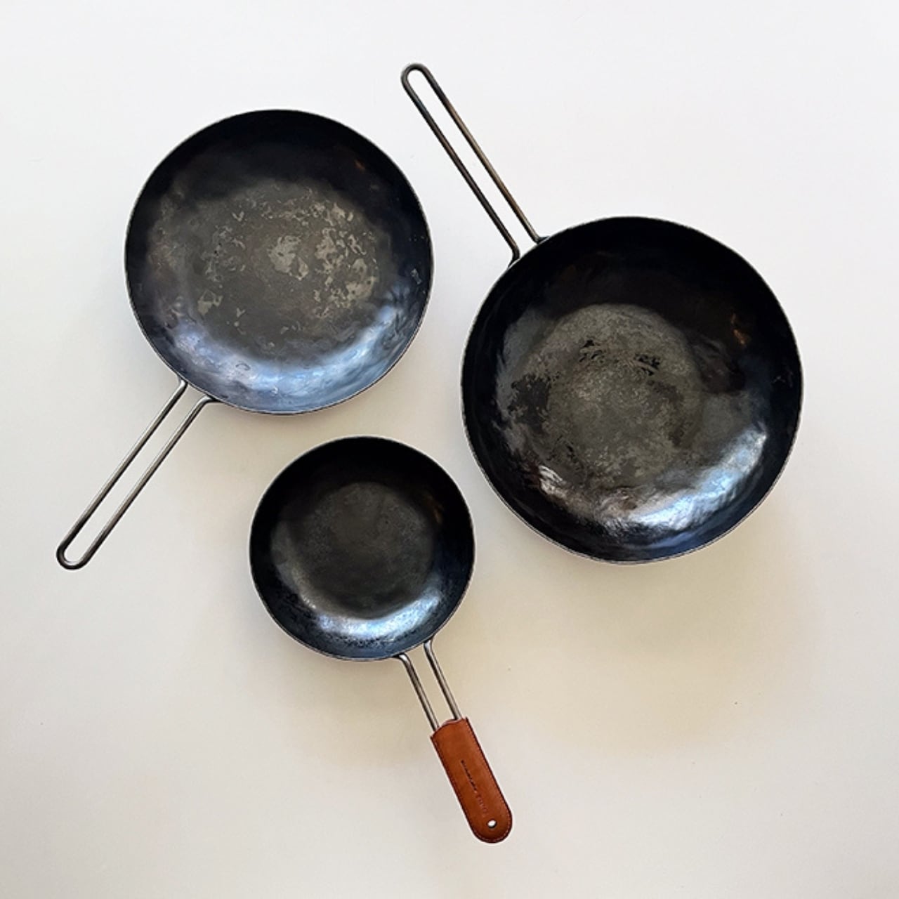 フライパンと中華鍋の「良いとこ取り」を目指し、深さをもたせ、底面の平らな部分を極限まで広くしました。小さい手の方でもしっかり握れ、鍋振りしやすいよう設計された柄は、収納でも引っかけたり出来て便利です。