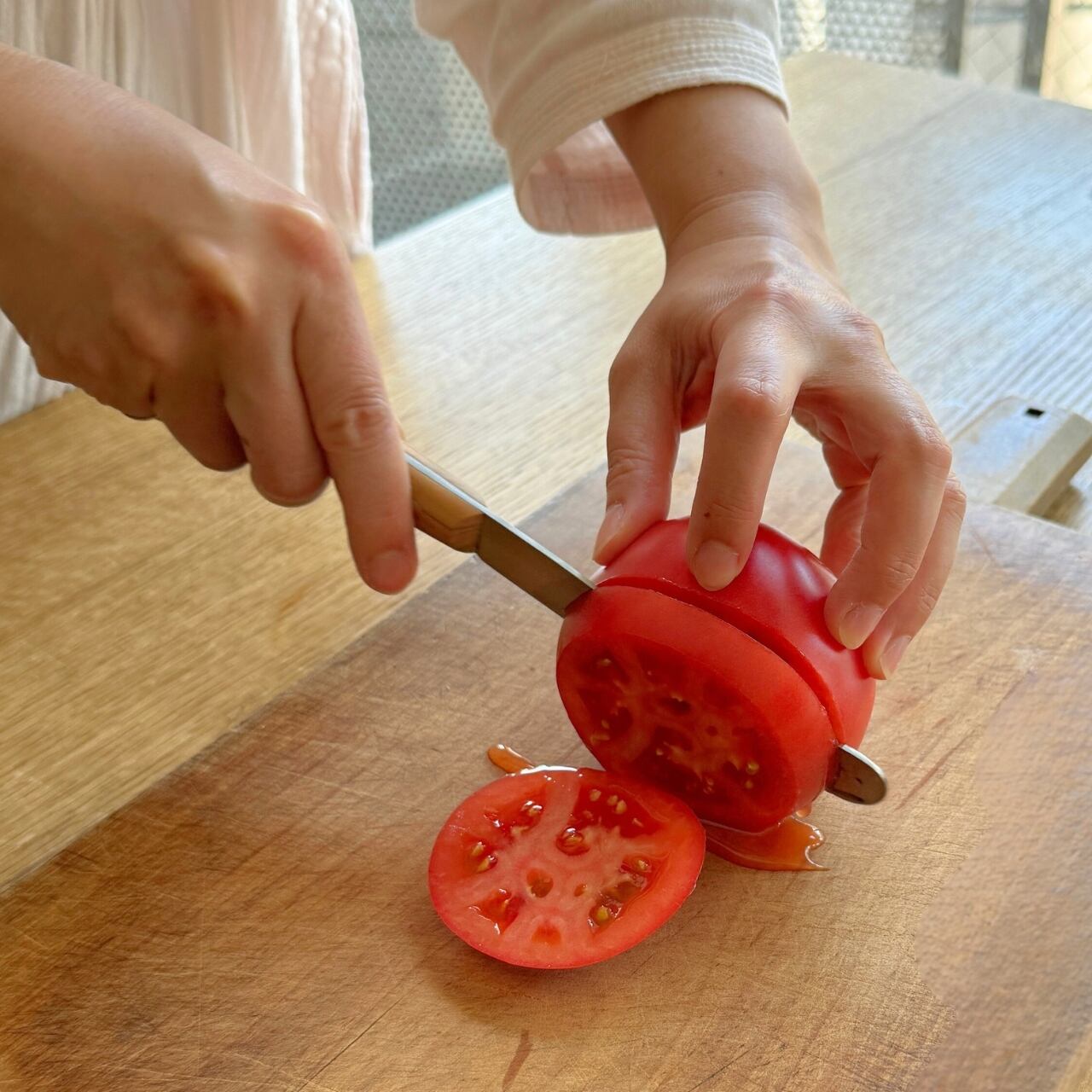 パンを切って、そのまま刃先でペーストやバターを塗ったり、カッティングボードとともに卓上に出し、バゲットやチーズ、サラミをカットしたり、果物を切ったりと万能にお使いいただけます。