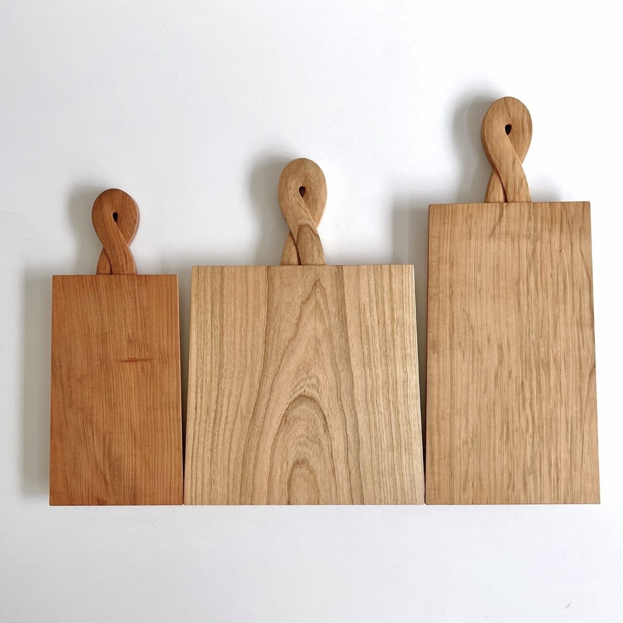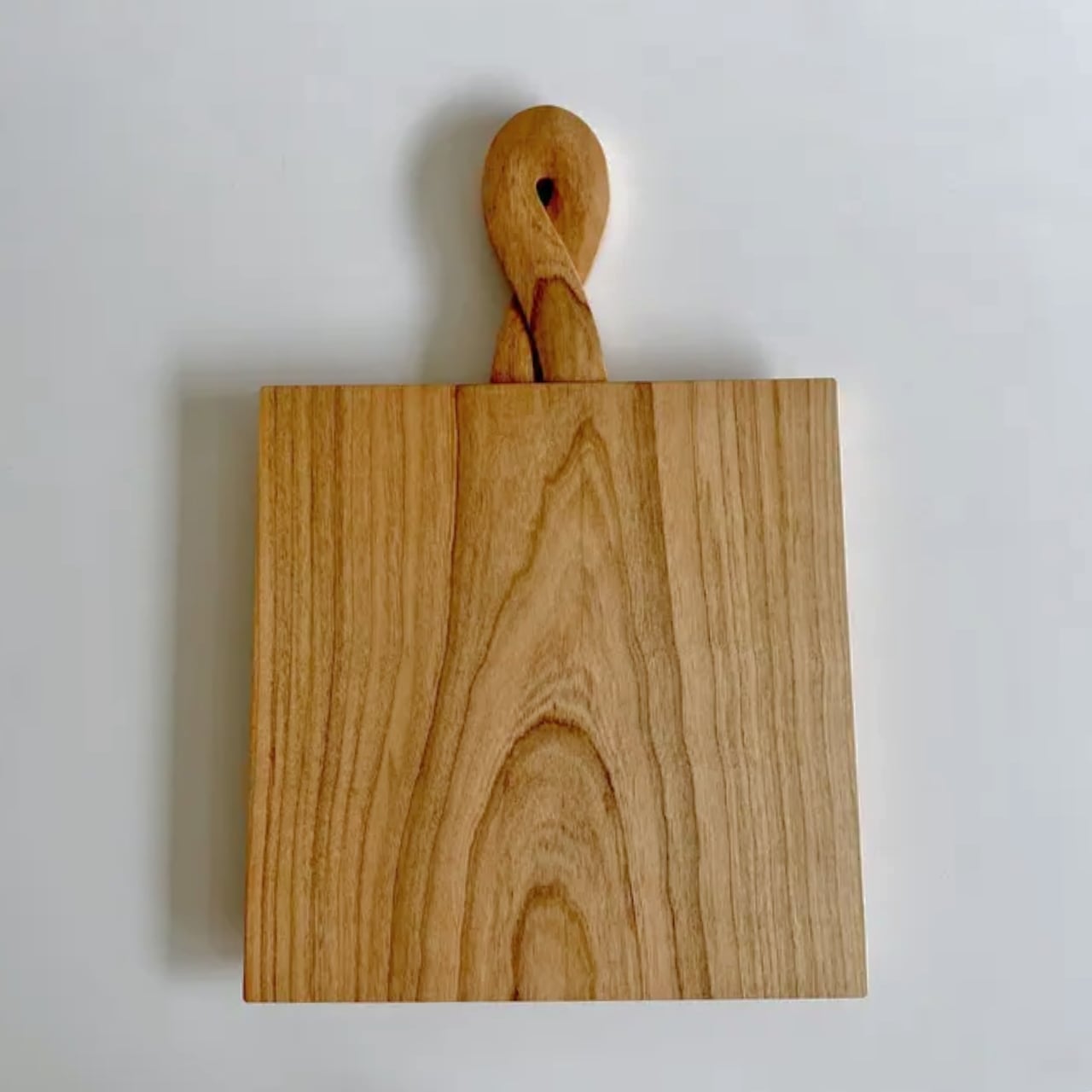 捻った形になっている取っ手が非常に握りやすく、取り出すにも、サーブするにもよい。プレート部分は周囲を樋型に面取りしているので、立て掛けやすい。使っていないときにも仕舞い込まず、壁に掛けるなど見せる収納をおすすめしたいです。