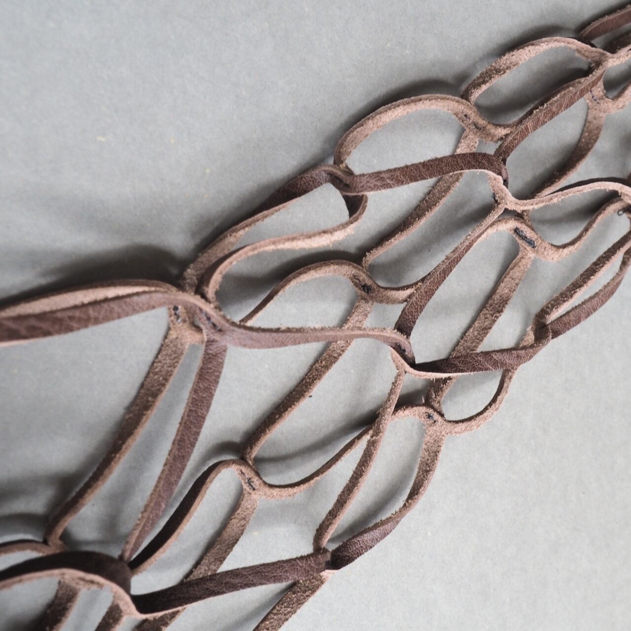 高級財布の製造を担う工房で、製品廃盤や仕様変更などの理由から使われずに残っている革を使用しています。大きさの違う革を細い紐状に加工することで、新たな製品の素材に活用しました。