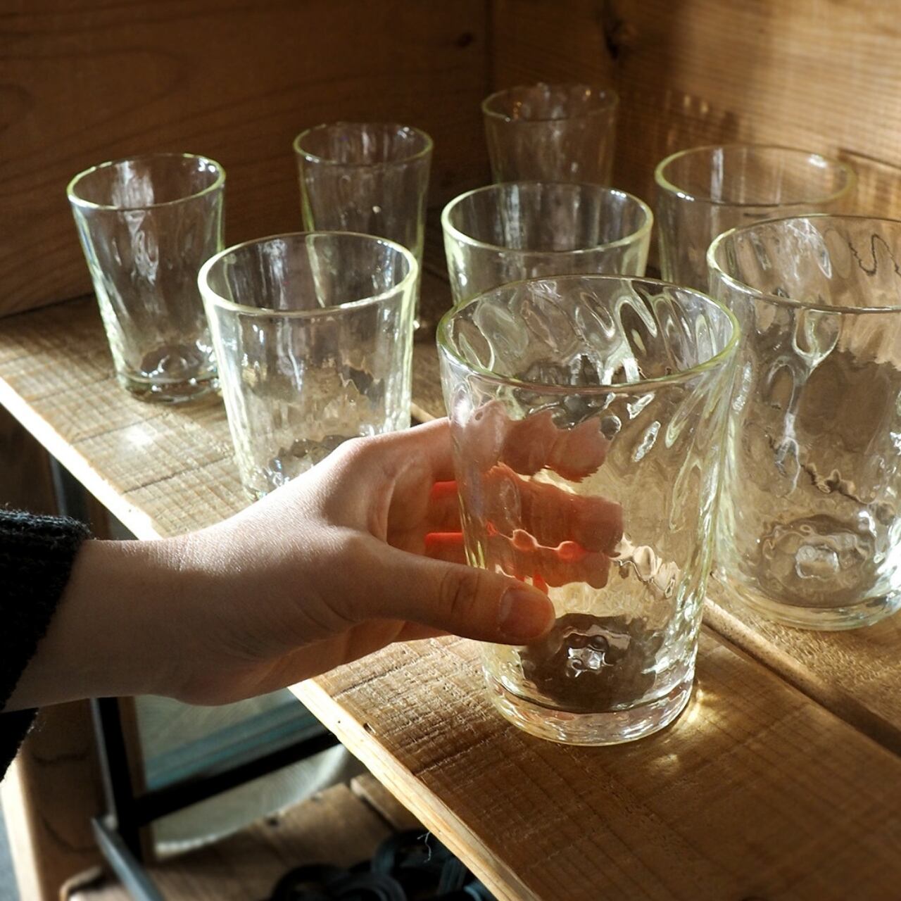 少し黄みがかったハチミツ色、厚みのある硝子は安心感があり、日常でご愛用いただきたい日用品の美しいうつわです。自然と手が伸び、グッと飲みたくなります。