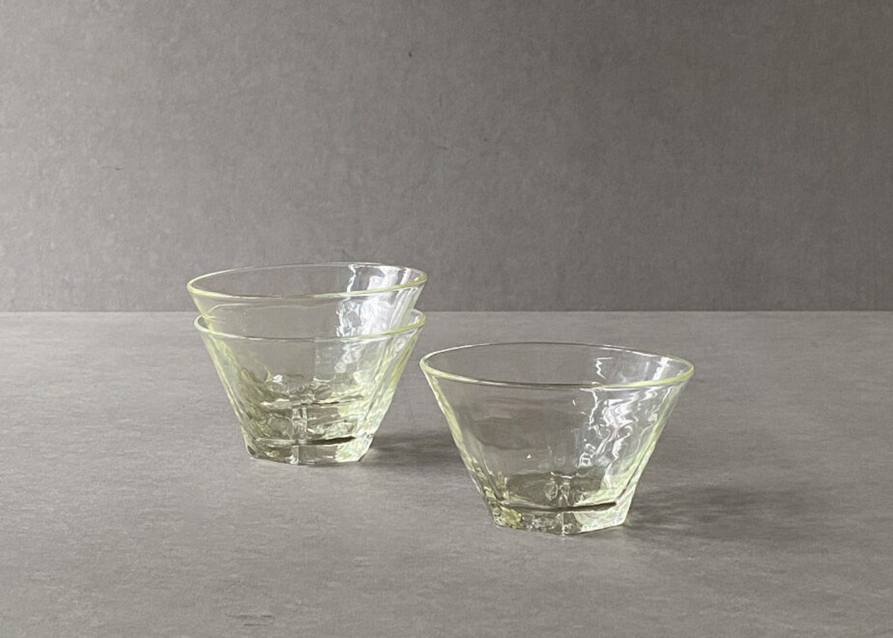 石川硝子工藝舎の面取鉢は、しっかりと、どっしりと、安心感がある硝子の鉢です。六角形の無骨な雰囲気と、波打つような揺らぎから、作家ならではの手仕事の跡を感じます。