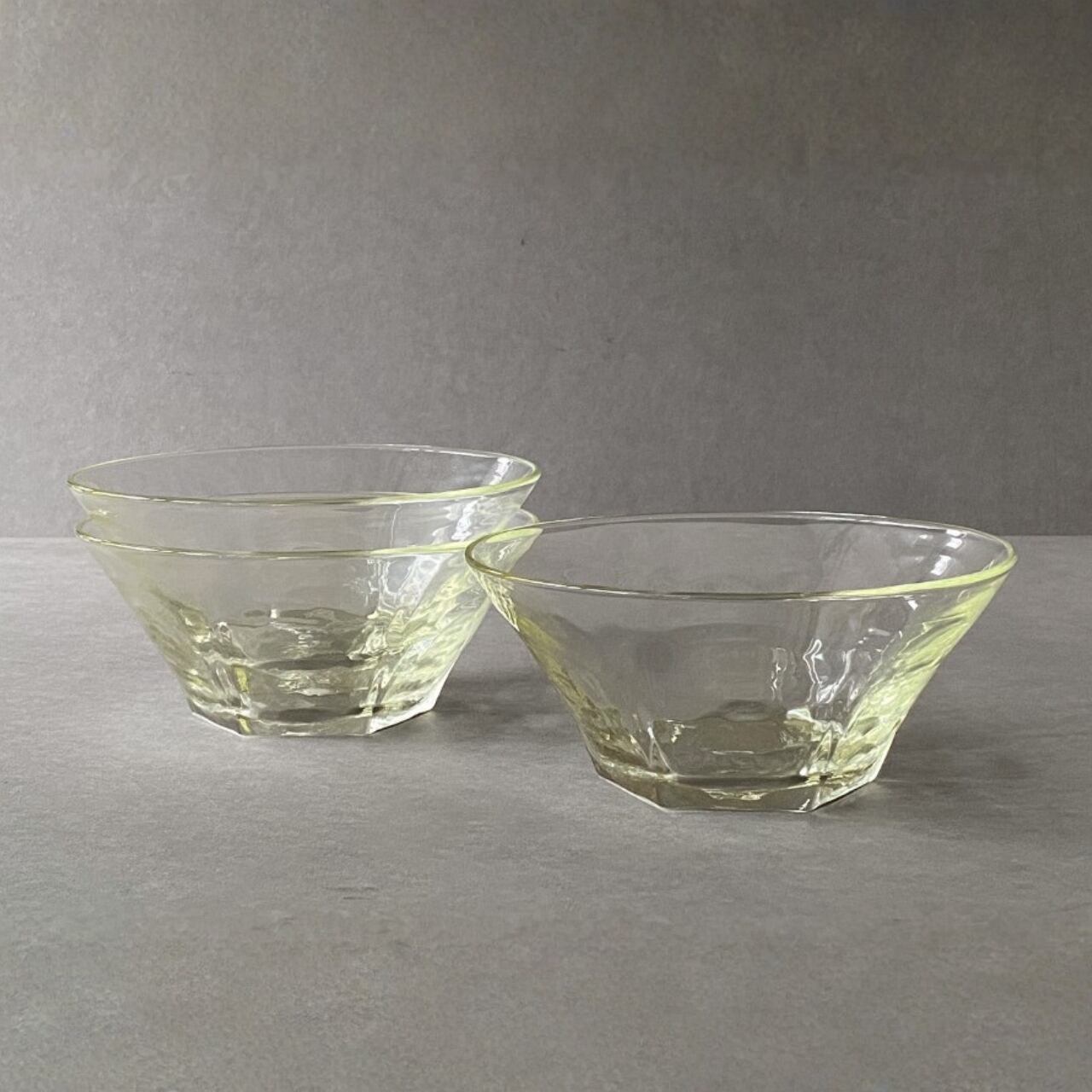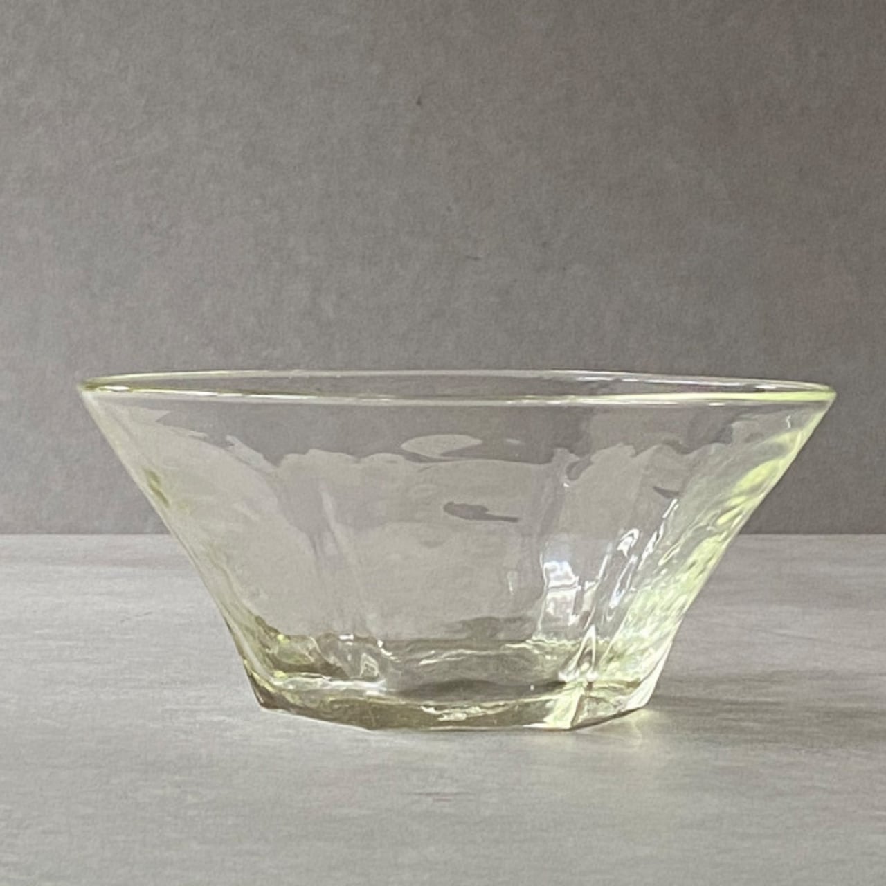 石川硝子工藝舎の面取鉢は、しっかりと、どっしりと、安心感がある硝子の鉢です。六角形の無骨な雰囲気と、波打つような揺らぎから、作家ならではの手仕事の跡を感じます。