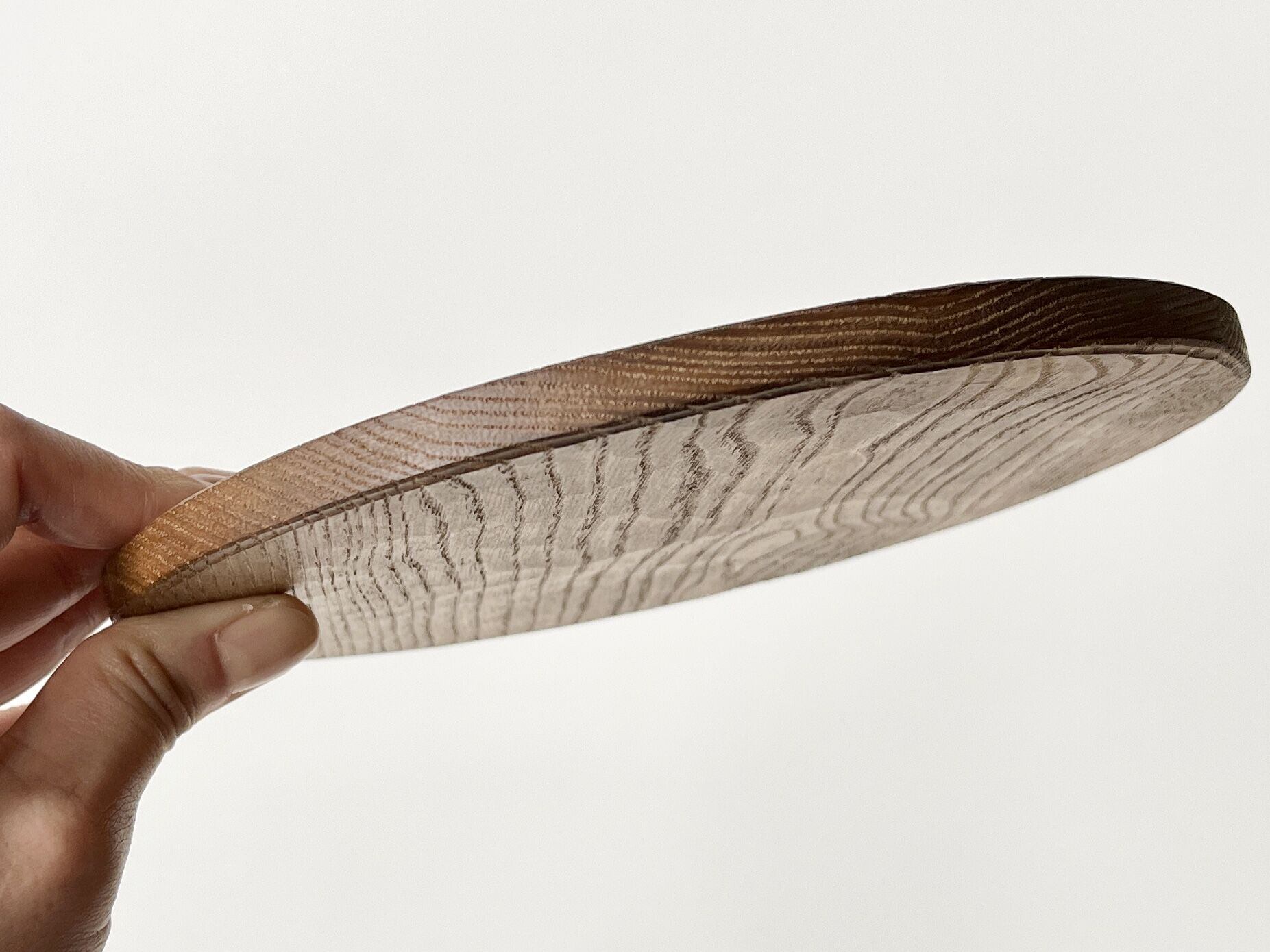 ほぼ正円にかたどられ、縁を丸刀で削ったり、全体にタッチをつけることにより柔らかさを出し、両面を使用できる形状に仕上げています。